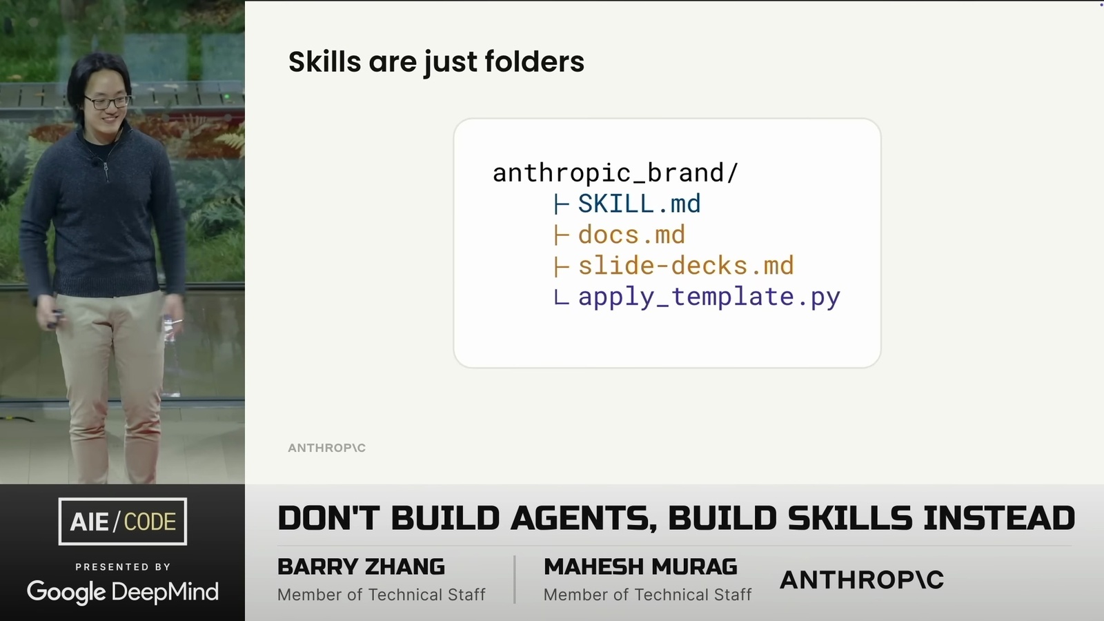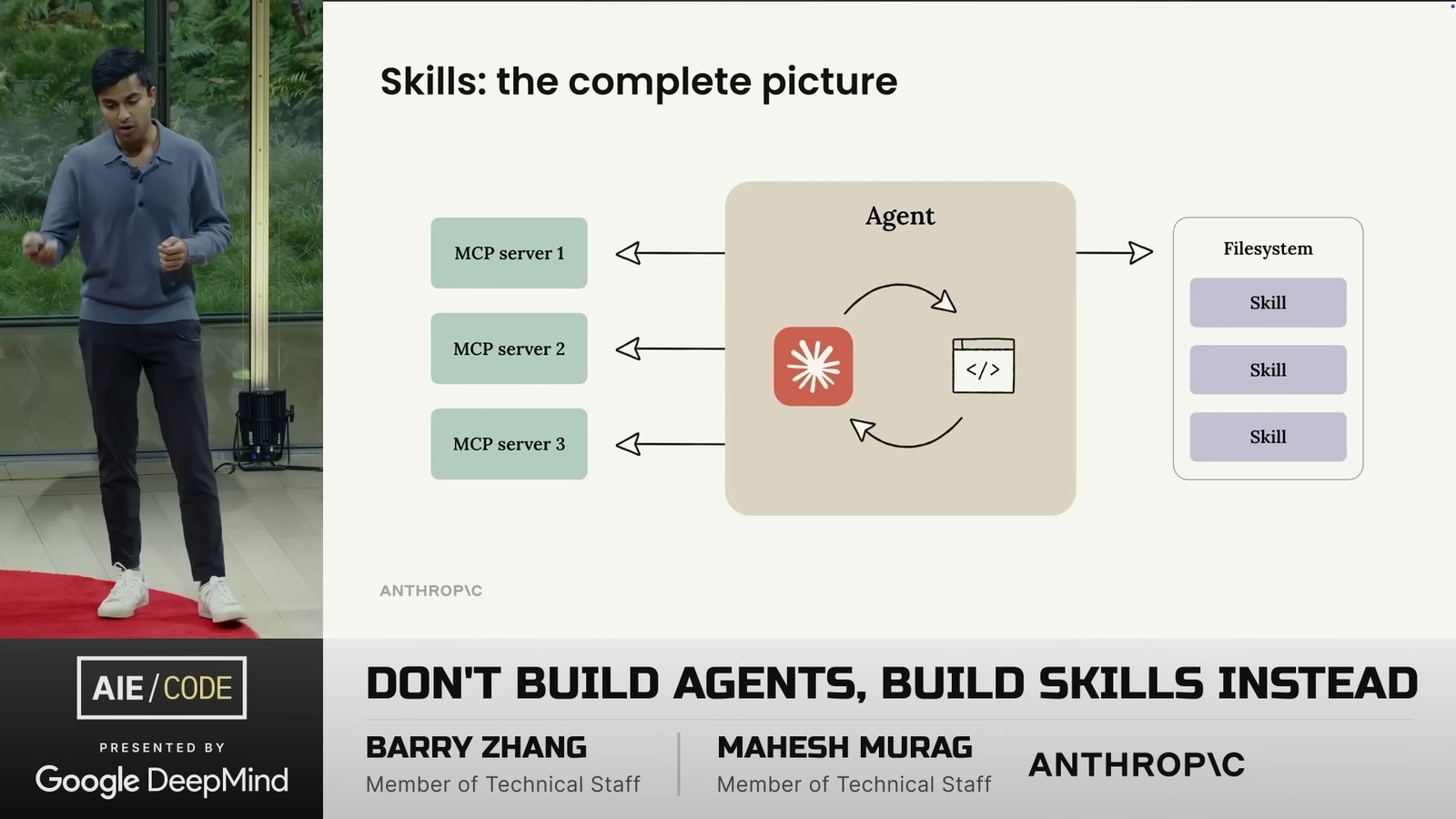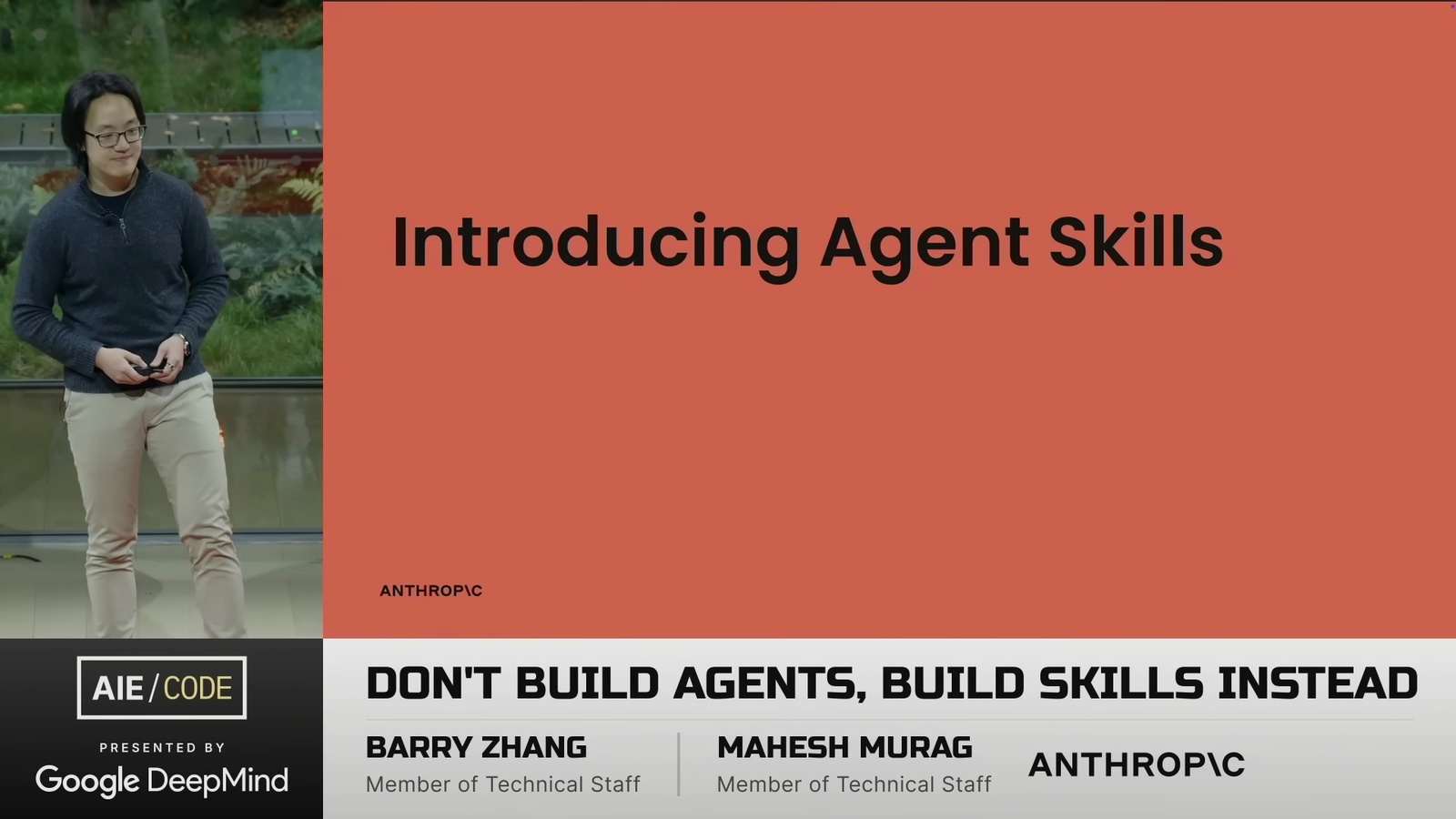 看了一場 Anthropic 的演講 Don’t Build Agents, Build Skills Instead,由 Barry Zhang 和 Mahesh Murag 兩位 Anthropic 工程師主講。這是我將影片轉成逐字稿的全文: ihower.tw/watch/dont_build_agents_build_skills_instead
