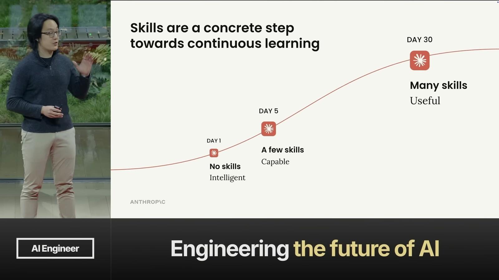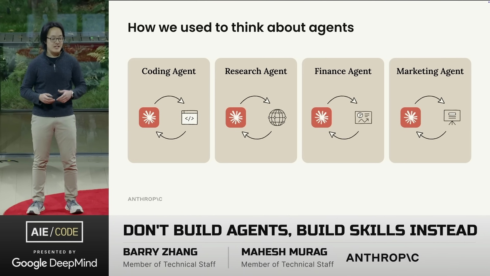 蠻精煉的一場演講。對我來說最大的啟發是: 與其花時間在 Agent 架構上,不如把領域知識好好整理成 Skills,這才是真正能累積和複利的東西。所以別再從零打造 Agent 了 — 把精力花在打造 Skills 上吧。